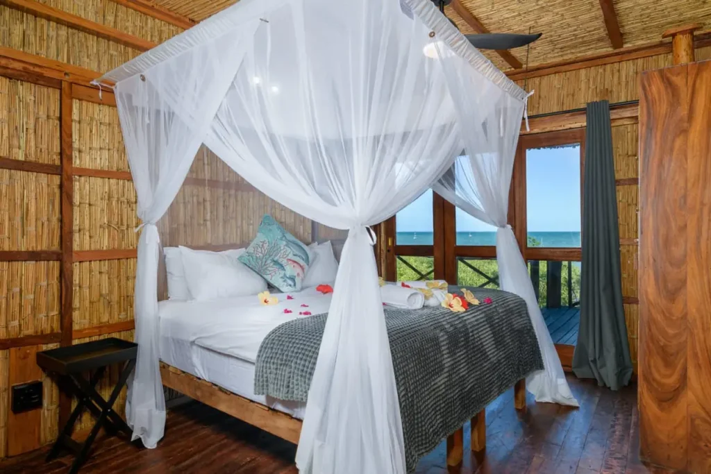 The 6 sleeper Villa features fans throughout and two aircon units, ensuring comfort for all guests. They are designed for self-catering, equipped with modern amenities including a fridge/freezer, a compact air-fry oven, an induction stove, and essentials like a kettle and toaster. For outdoor dining, there’s a large gas grill on the deck, complemented by a lounge TV for entertainment, making it an ideal setting for a relaxing stay.